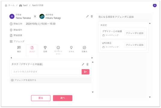 直近取り組んだタスク、目標や雑談など、話したいアジェンダを選んで追加できます。タスク管理機能と連携しているため、会話したいタスクを選ぶだけでアジェンダを追加できます。