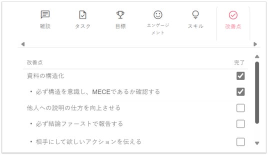 1on1で生まれた改善点は、次回の1on1画面でもアジェンダとして表示され、完了するまで進捗を管理できます。