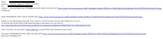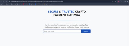 このフィッシングメールの件名には、Google Apps Scriptのページへとユーザーを誘導するリンクが含まれています。そのページには、ユーザーを欺く目的で作られたURLが表示されており、その中に「script.google.com」という文字列が含まれています。