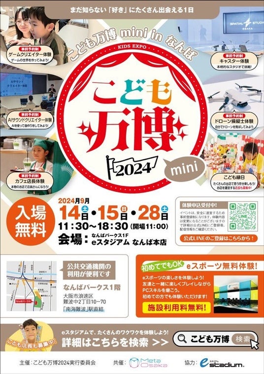 株式会社Meta Heroes(住所:大阪府大阪市、代表取締役:松石和俊、以下「当社」)は、こどもから大人まで学べるDX教育スペース「Hero Egg」(住所:大阪府大阪市)を活用したイベントとして「こども万博 mini in なんば」(主催:こども万博2024実行委員会、共催:株式会社Meta Osaka)へクリエイター体験を実施いたしました。