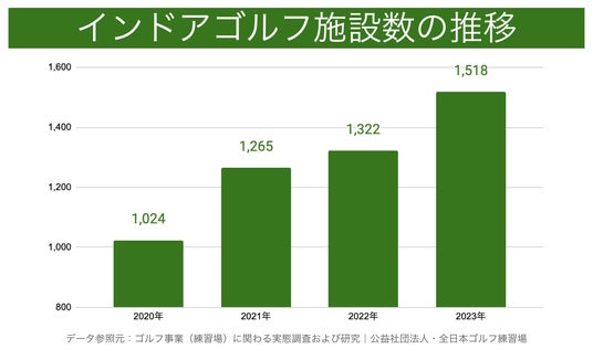 公益社団法人・全日本ゴルフ練習場が発表した「ゴルフ事業(練習場)に関わる実態調査および研究」によると、インドアゴルフ施設は、2020年10月時点で1,024施設、2023年10月時点で1,518施設と、過去3年間で約1.5倍に増加しています。