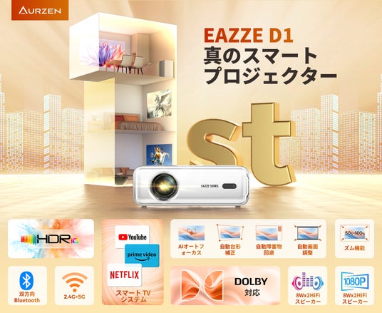 【38%以上OFF】最コスパ最高!4K対応スマートプロジェクター(オートフォーカス、自動台形補正など)!公式Netflix/youtubeなど、Dolby対応。Aurzen D1 【先着40名限定】
