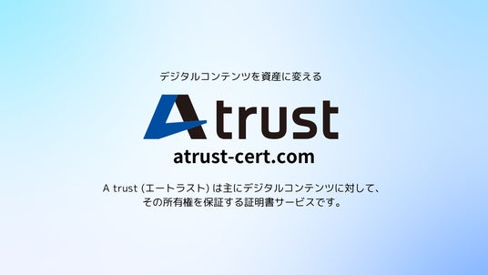 「A trust」は主にデジタルコンテンツの所有権を証明する、登記簿のようなサービスです。A trust 証明書はブロックチェーン上に記録されるため、改ざんに強く、目に見えない権利情報の正確性を保証します。また、コンテンツの譲渡のたびにその履歴を記録するため、データの流通を管理することができます。