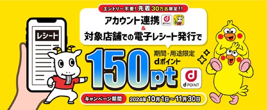 なお、本協業の開始を記念して、2024年10月1日(火)から2024年11月30日(土)までの期間で、「dアカウント(R)」と「スマートレシート(R)」を連携したお客さま先着30万名さまにdポイント(期間・用途限定)を150ポイント進呈する「スマートレシートとdアカウントを連携し、電子レシート発行でポイントプレゼントキャンペーン」を開催します。