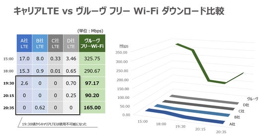 ▼図1「通信4大キャリアおよびヴルーヴのフリーWi-Fiの通信速度の調査結果」