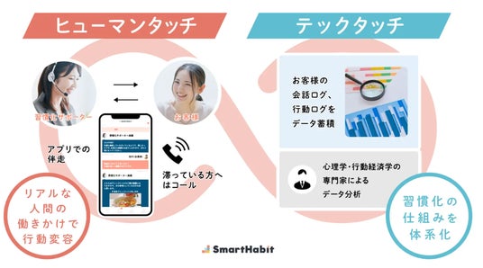 Smart Habitは、社会心理学・行動経済学の専門家が4万人の行動データから導き出した習慣形成理論により、世の中から三日坊主をなくす行動継続プラットフォームです。習慣化サポーターとユーザー間に会話によるラポール(親密な信頼関係) を築くことで、離脱因子を徹底的に取り除き、行動の継続を促します。また、リアルなサポーターの伴走と自動化されたプログラムの組み合わせにより、1人のサポーターが同時に3000名のユーザーを担当することが可能となり、低価格での行動習慣化を実現しました。2018年のサービス開始以来、ユーザー数は順調に増加し、現在では累計4万人のお客様をサポートしています。語学など教育分野の学習習慣化で多くの大手企業様に導入していただき、学習完了率70%以上の実績を上げてきました。2021年からはこれらのノウハウの横展開をスタートしています。サブスクリプション事業者向けにお客様のチャーン防止・LTV向上をサポートする「Smart Habit LTV」や、ヘルスケア業界の習慣化をサポートする「Smart Habit Healthcare」をローンチし、フィットネスおよびヘルスケア領域でのサービスの拡大を図っています。