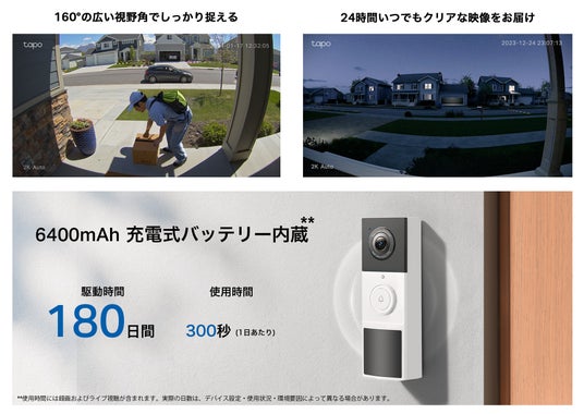 Tapo D210は、スマートドアホンキットとして先進的なセキュリティ機能を提供します。最大6か月間使用できる長持ちバッテリーにより、頻繁な充電の手間を省き、便利さを実現します。300万画素の2K解像度カメラは、昼夜問わず細部まで鮮明で色彩豊かな映像を映し出し、160°の広角レンズで訪問者の顔から手元まで広範囲をしっかり確認できます。