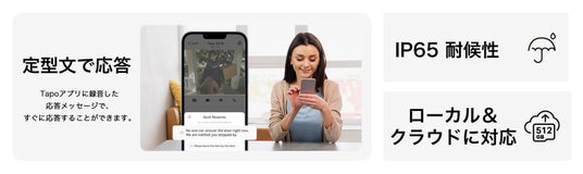 Tapoアプリを使えば、録音した音声メッセージで素早く応答することができ、IP65の防水・防塵性能であらゆる気象条件下でも安心して使用できます。さらに、最大512GBのmicroSDカードやTapo Careクラウドサービスを使って録画映像を柔軟に保存可能です。*1