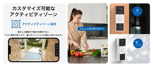 カスタマイズ可能なアクティビティゾーン機能で、指定したエリア内の動きを即座に検知し通知します。音声コントロール機能を使って、Amazon AlexaやGoogleアシスタントと連携し、簡単にデバイスの操作や自動化設定が行えます。*2 付属の角度調整パーツで設置場所に合わせた最適な角度に調整できるのも便利です。