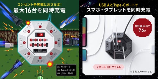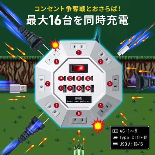 最大16台を同時充電できるAC×8、USB-A×4、USB Type-C×4に対応した電源タップ