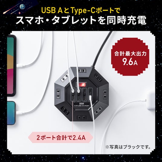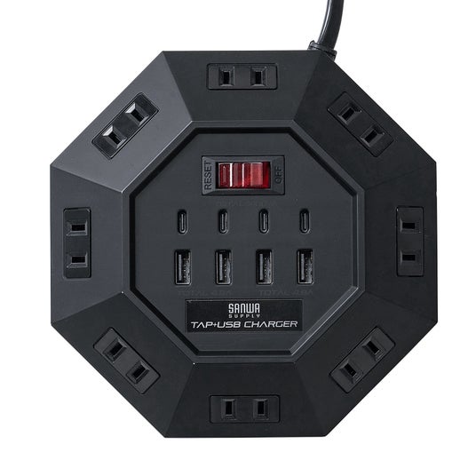 電源タップ USB充電付 クランプ固定 8個口 八角形 Type-C対応 ケーブル3m ブラック