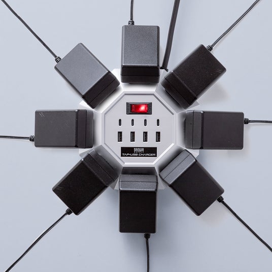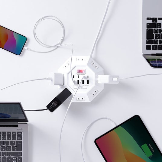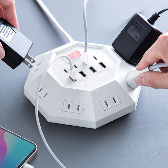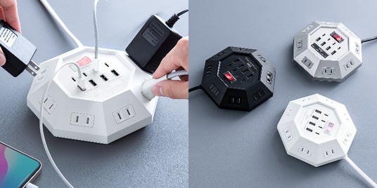 八角形のデザインで、どの方向からでも差し込むことができます。ACアダプタが干渉しにくい設計のため、全ての差込口を有効活用でき、ケーブルが絡む心配もありません。
