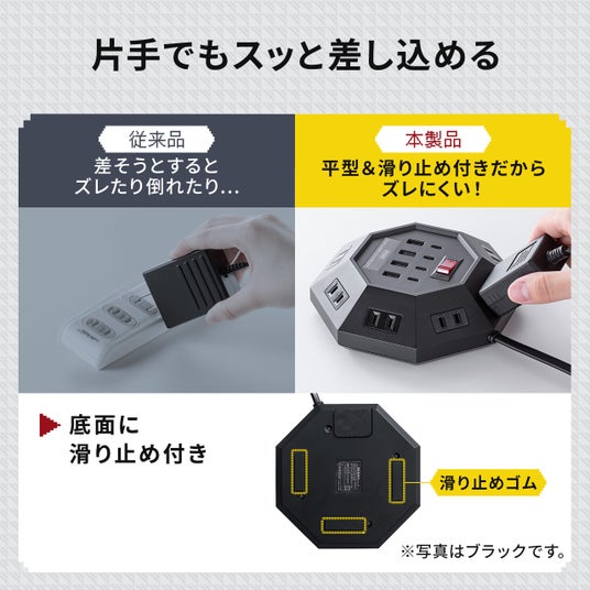 本体底面の滑り止めゴムが滑りを軽減させるため、片手で差し込んでもズレにくい構造になっています。