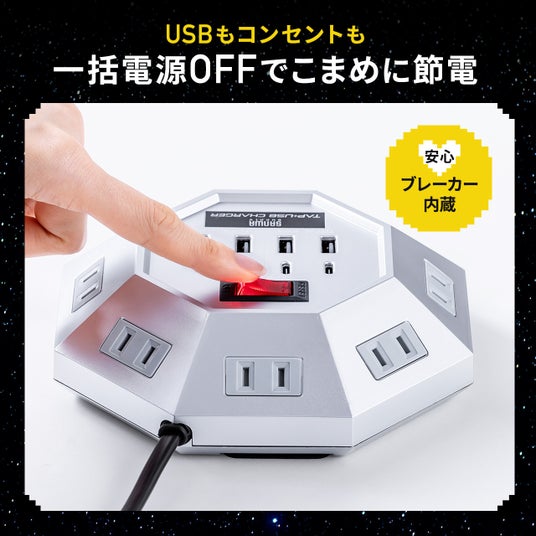 電源タップ USB充電付 クランプ固定 8個口 八角形 Type-C対応 ケーブル3m ホワイト