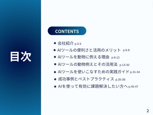 現代のビジネス環境では、AIツールの重要性が増しており、これらは単なる自動化を超えて業務の質を向上させる大切な手段となっています。そのため、AIツールの特性や使い方を正しく理解することが鍵となります。本レポートでは、AIツールの機能や利点を直感的に理解できるよう動物に例えて解説し、実際のビジネスシーンで生産性を向上させるための具体的な活用方法を解説しています。