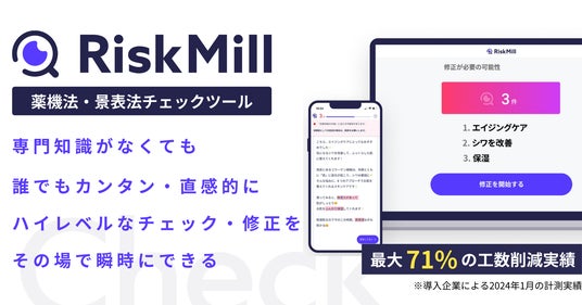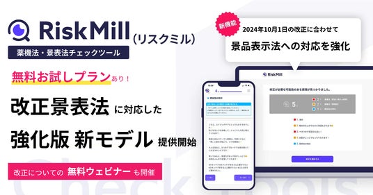 株式会社Crew(代表取締役:柳澤龍一、本社:東京都渋谷区)は、10月1日より改正景品表示法(「不当景品類及び不当表示防止法」)が施行されることを受け、AI薬機法チェックツール「RiskMill(リスクミル)薬機法チェックツール」(以下、「RiskMill」)の、改正景品表示法に対応した新モデルの提供を開始しました。また、RiskMillを共同開発・運営する株式会社サイバー・バズと共同で、景品表示法について、基礎から改正での変更点と対策までを事例を用いながら解説する無料ウェビナーを10月10日(木)13時より開催いたします。