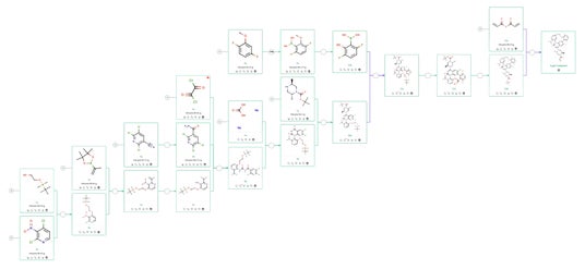 メルク社は、G12C変異型KRASタンパク質を選択的に阻害するヘテロアリール化合物を発見し、有用な治療アプローチを提供しています。今回は、ChemAIRSを使用してKRAS G12C変異型をターゲットとした小分子阻害剤の合成経路を探索しました。目的化合物データを入力した3分間で、ChemAIRSはマクロ環状分子の複数の合成経路を生成しました。その中の1つの反応経路(スキーム1)は、メルク社が最近報告した合成経路に密接に一致していました。