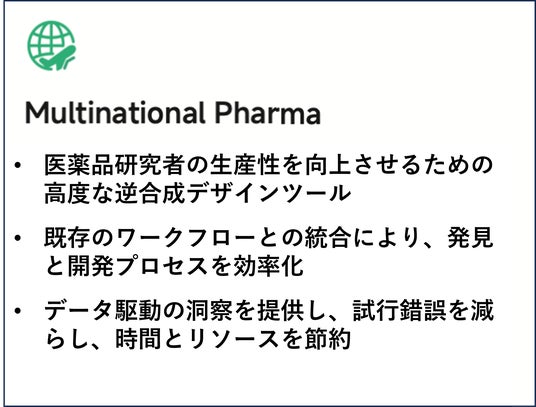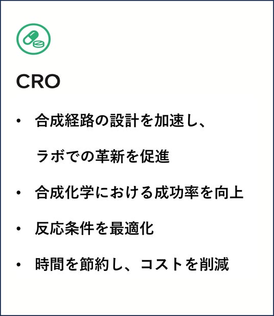 10年の合成経験を持つ専門家と同等の能力を有します。合成経路を迅速設計し、通常必要とされる経路開発の時間を大幅に短縮します。化学者はより研究活動に集中することができます。