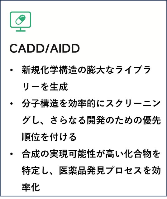 AIによる逆合成解析で、低分子新薬発見のプロセスを加速させることが可能となります。最も効率的かつ実現性の高い反応経路をAIが提示します。迅速な実験系のデザインと生産コスト管理を実現します。