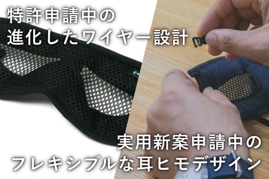 第3弾となる今回の商品は、製法を一から見直した新立体構造で特許を出願。また、新仕様として採用した耳掛けゴムの上部を外し付け替えることで首の後ろに回すことができるようバックゴムタイプに変更も可能。マスクやめがね、VRゴーグル、睡眠時などご利用シーンの応じて簡単に付け替えが可能になりました。