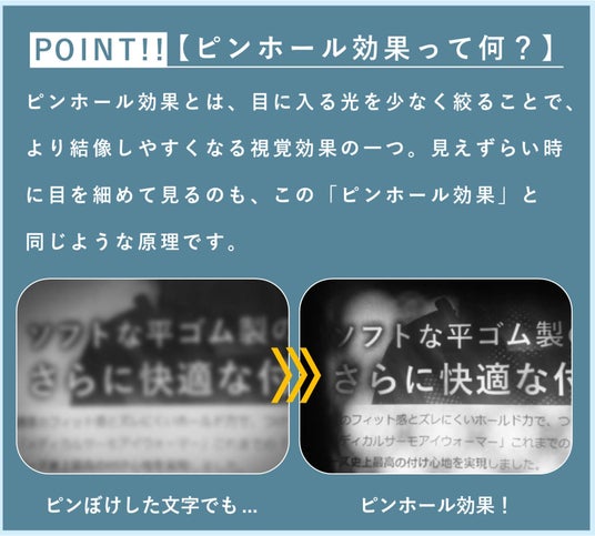 肌に当たる内側には蓄熱保温素材を使用。体温を伝い目の周辺をじわーっと温めながら、メッシュ生地の小さな穴越しに見ることによる”ピンホール効果”でコンタクトレンズや老眼鏡を使わなくても手元の文字がが見えやすくなります。軽作業時や乗り物移動、短時間での休息時から睡眠時にも効果的です。