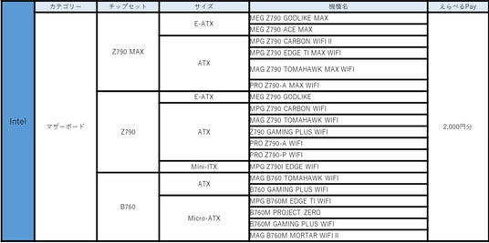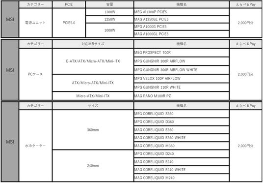 MSI、対象のチップセット搭載マザーボードや一部のMSI 簡易水冷クーラー・電源・PCケースを購入後、指定サイトにレビューを投稿した全員に2,000円分のえらべるPayが必ずもらえる!
