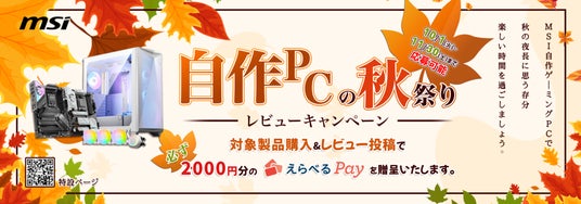 この度、エムエスアイコンピュータージャパン株式会社は、2024年10月1日(火)から2024年11月30日(土)までの間、対象のZ790/B760/X870/X670/B650チップセットを搭載したDDR5メモリ対応のマザーボード又は一部のMSI簡易水冷クーラーや電源ユニット、PCケースを購入後、価格.comなどの指定サイトにレビューを投稿いただいた方全員に、最大2,000円分のえらべるPayをプレゼントする自作PC秋祭りレビューキャンペーンを実施いたします。
