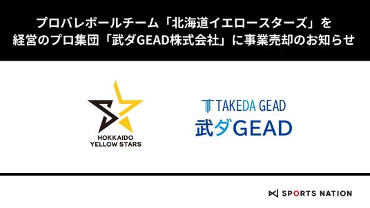 スポーツを通じた地域活性化プラットフォームを展開する株式会社スポーツネーション(本社:東京都豊島区、代表取締役:三木智弘)は、2019年に経営破綻したプロバレーボールチーム「北海道イエロースターズ」を地元企業9社と共同経営を行い、5年で売上を40倍にし、リーグ優勝に導きました。そして、この度「世界に誇れるチームを創り、スポーツチームを起点とした北海道経済の活性化」というビジョンに共感した「武ダGEAD株式会社」に事業売却を実施、グループインしたことをお知らせいたします。