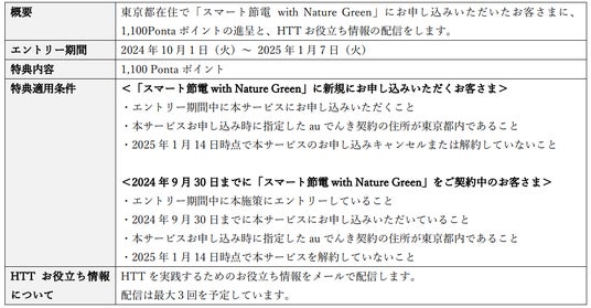 auエネルギー&ライフ(以下 当社)は2024年10月1日、東京都と連携して、電力安定確保や脱炭素化に向けたアクション「HTT」の推進施策(以下 本施策)を開始しました。本施策は当社が提供する家庭向け節電サービス「スマート節電 with Nature Green」(以下、本サービス)にお申し込みいただいた方を対象としており、1,100Pontaポイントを進呈するほか、節電情報などHTT関連情報を月に一度メール配信します。
