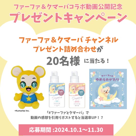 「ファーファ」と「クマーバ」のコラボ動画配信を記念して、子育てに役立つアイテムの詰め合わせセットを20名様にプレゼント!