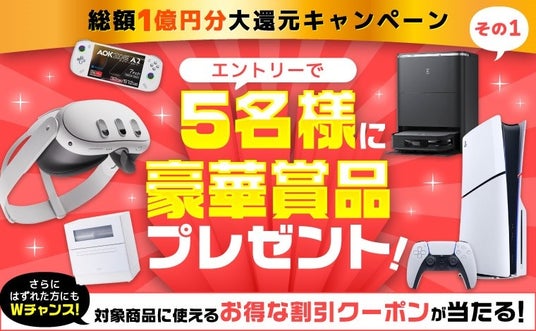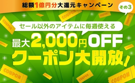 期間中ご購入いただくことで豪華賞品が当たるキャンペーンや、セール品以外のご購入時に使える割引クーポンなど、総額1億円分を大還元!計3つのキャンペーンがありますのでお見逃しなく!