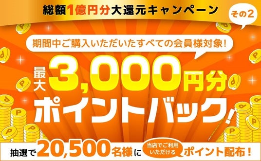 【2】お買い物で自動エントリー!抽選で計20,500名様に最大3,000円分ポイントバック!