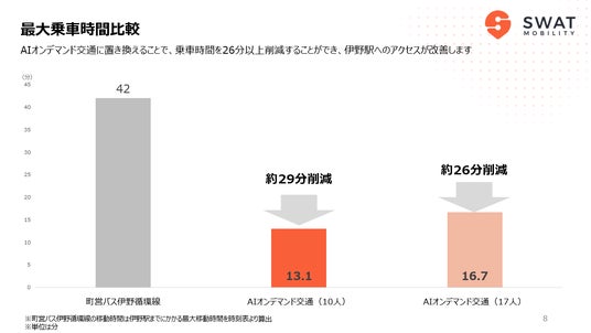 SWATは、令和5年度に高知県いの町の利便増進実施計画策定を支援した際に、町営バス伊野循環線のJR伊野駅へのアクセス改善への施策として、乗降データや人流データを元に、AIオンデマンド交通導入に向けたデータ分析・シミュレーションを実施しました。その結果、従来の定時定路線と比較すると、乗車時間を26分以上削減できる可能性があり、利用者の利便性が大きく向上することが分かりました。本シミュレーション結果を踏まえ、AIオンデマンド交通の実証運行を10月2日から開始しました。定時定路線型の輸送が適している朝夕の通勤時間帯に関しては、定時定路線の運行をそのまま維持し、日中の時間帯のみオンデマンド交通の提供を行います。SWATは、本実証実験を通じて、相乗り率や乗車人数を最大限に引き上げるために、200以上のカスタマイズ可能なパラメーターを調整、また、継続的に移動データ分析(予約の成立率や乗車時間の傾向の理解など)を行い、サービスの改善を繰り返していきます。