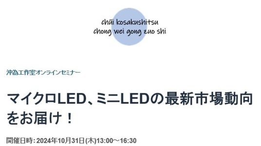 沖為工作室合同会社(本社:東京都町田市、CEO:沖本 真也)は、2024年10月31日(木)にオンラインにて「マイクロLED、ミニLEDマーケットトレンド【オンラインセミナー】」を開催いたします。本セミナーではマイクロLEDやミニLEDを取り巻く環境と今後の展開についての分析を始め、マイクロLED・ミニLED市場の最新情報を取り入れ、幅広い視点から解説します。