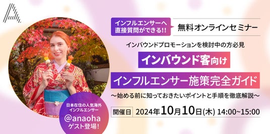 株式会社A(https://acetokyo.com/)は、「インバウンドプロモーションを検討中の方必見!インバウンド客向けインフルエンサー施策完全ガイド」と題した無料ウェビナーを、10月10日(木)にオンラインで開催します。フォロワー12万超えの人気インフルエンサー・アナ様のゲスト出演も決定しており、インフルエンサー視点からプロモーションの秘訣をお話しいただきます。