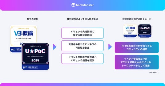 法人向けにWeb3ソリューションを展開する株式会社クリプトリエ(所在地:東京都中央区、代表取締役CEO:手塚康夫、以下クリプトリエ)は、国立大学法人電気通信大学(所在地:東京都調布市、以下電気通信大学)の講義「ベンチャービジネス概論」高木克人特任准教授と学生向けアイディア実証コンテスト「U☆PoC~UECアイディア実証コンテスト~」にNFT活用プラットフォームの「MintMonster(ミントモンスター)」の技術を活かしたサービスの構築を実施したことをお知らせいたします。