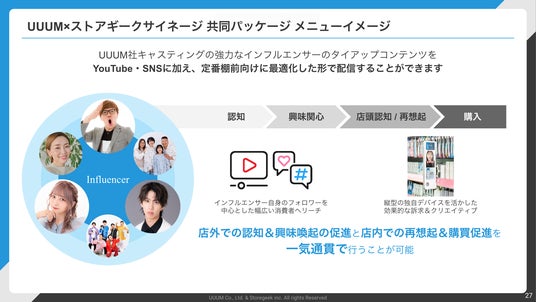 UUUM株式会社(本社:東京都港区、代表者:代表取締役 社長執行役員 梅景匡之、以下「UUUM」)と株式会社ストアギーク(本社:東京都港区、代表者:代表取締役 廣瀬隆昌、以下「ストアギーク」)は、リテールメディアサービス「ストアギークサイネージ」において、共同サービスの提供を開始しますので、お知らせいたします。