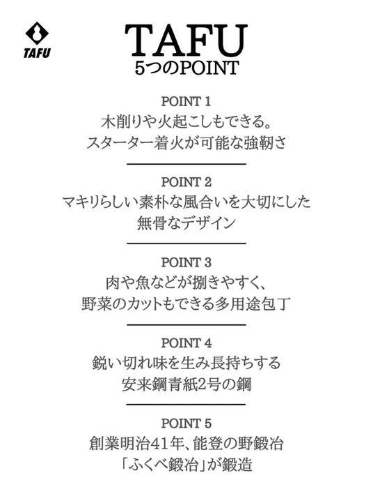 私たち『ふくべ鍛冶』は能登の地で野鍛冶を営んでおります。明治41年の創業以来、115年にわたり、ひたすらによいものを都精進し鍛造してまいりました。今回、応援いただきたい【TAFU(タフ)】は、以前からお客様にたくさんの要望をいただいた「アウトドアシーンで使える包丁」をカタチにした一丁です。