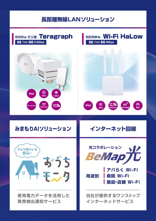 スマートメーターによって取得した電力使用量のデータをAIで解析する見守りソリューション「おうちモニタ」と、インターネット回線サービス「ビーマップ光」と合わせてワンストップで提供可能な集合住宅向け、病院向けなどのWi-Fiソリューションなどのサービスをご紹介します。