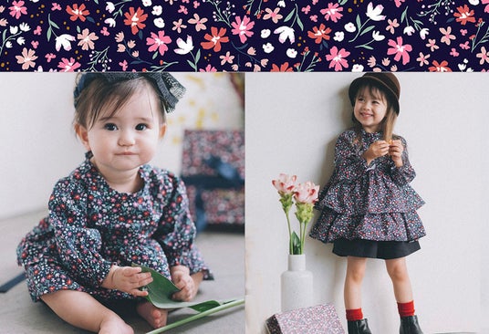 「舞うように~FLOWERS DANCE~」は、秋冬のシーズンにぴったりの、深い色合いに散りばめられた可憐な花柄が特徴です。目を閉じれば聞こえてくる音楽に合わせて、蝶や花が舞い踊る風景をイメージしたデザインで、お子さまの可憐さを引き立てます。