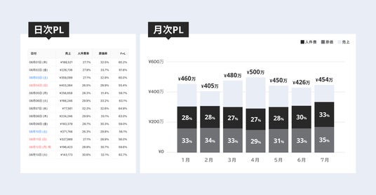 「レジ締め」や「勤怠締め」など1日の営業終了時に、人件費率を算出します。(※)また、出勤時に店舗の目標を確認し、退勤時に振り返りを行い、上長からのフィードバックメッセージを送れるため、従業員満足度(ES)の向上に貢献します。さらに、出勤のたびに習得スキル目標を選択してもらうため、体系的にスキルが可能になる他、従業員ごとにどのようなスキルを持っているか管理が可能です。