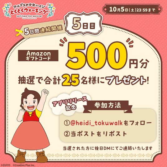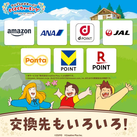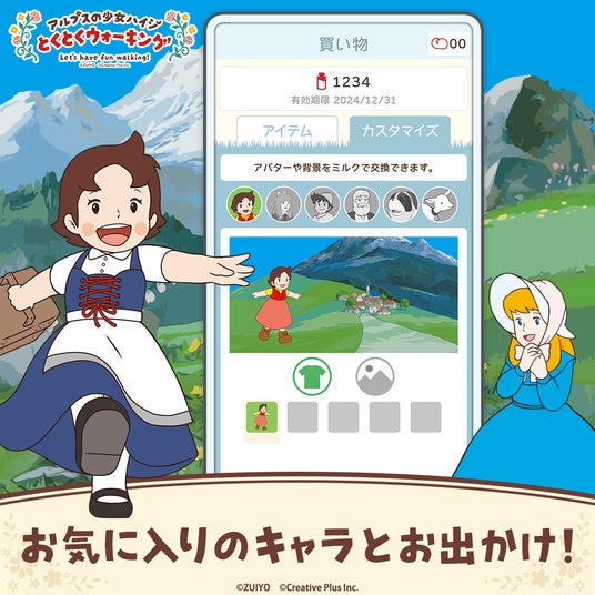 株式会社エムアップホールディングス(所在地:東京都渋谷区、代表取締役:美藤 宏一郎)の連結子会社であるキャラクターやアニメIPを活用したコンテンツ配信やコラボ実施を手掛ける株式会社 Creative Plus(所在地:東京都渋谷区、代表取締役:加藤 周太郎)と、株式会社アルグラフ(所在地:東京都文京区、代表取締役:塙智明)は、株式会社サンクリエート(所在地:東京都墨田区、代表取締役:家後敏彦)より、今年放映50周年記念を迎えた「アルプスの少女ハイジ(以下、「ハイジ」)」の利用許諾を受け、ポイ活アプリサービス「アルプスの少女ハイジ とくとくウォーキング(以下、本アプリ)」を配信開始したことをお知らせいたします。