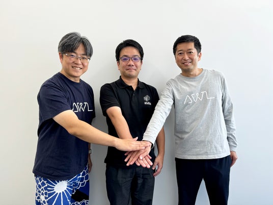 左より 土田安紘 AWL取締役CTO、尾上剛 アジラ代表取締役CEO、北出宗治 AWL代表取締役社長兼CEO