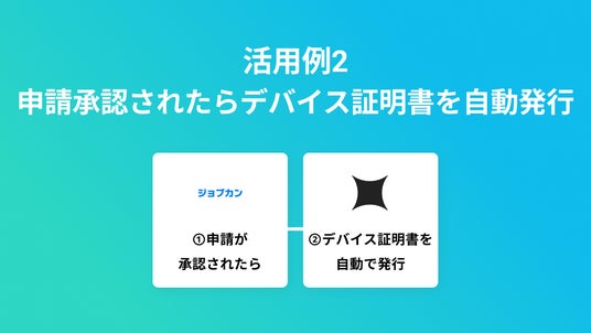 ジョブカンやKickflowなどで申請が承認されたらHENNGE Oneのデバイス証明書を自動的に発行するフローです。これによりミスや対応漏れといった人的エラーのリスクの軽減が期待できます。