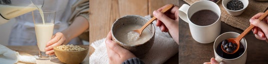 【左から】まるごと豆乳、甘酒、薬膳ホットスムージー(五黒ミックス)、黒豆茶