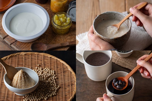 【左上から】ヨーグルト、甘酒、一晩味噌、薬膳ホットスムージー(五黒ミックス)、黒豆茶