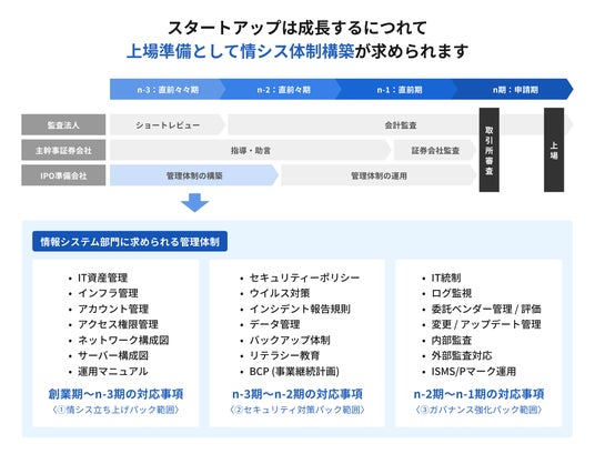 上記のような課題を元に、スタートアップ企業に特化し、N-3~N期までに必要な情報システム部門に求められる体制を体系化し本プランの開発に至りました。