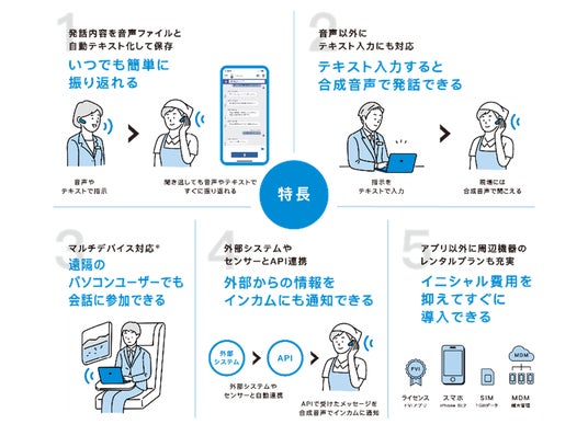 「フィールドボイスインカム」はスマートフォンをインカム・トランシーバーのように活用できるアプリケーションです。AIにより音声認識技術や音声合成技術を有し、現場のコミュニケーションを効率化できます。世界中のフロントラインワーカー(デスクレスワーカー)を支援し、現場からグローバル経済全体を刺激して、元気あふれる社会の実現を目指します。