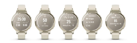 左から、ランニング、Body Battery、フィットネス年齢、ヘルススナップショット、睡眠スコア ※画面は、Lily 2 Active Bone / Lunar Gold