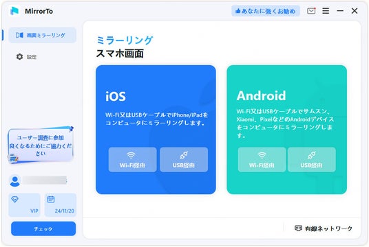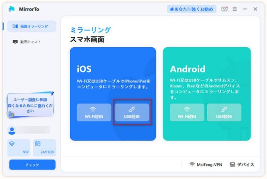 ステップ1. 上のボタンからMirrorToをダウンロードして起動します。そして、メインフェースで左側のiOS画面で「USB経由」を選択します。